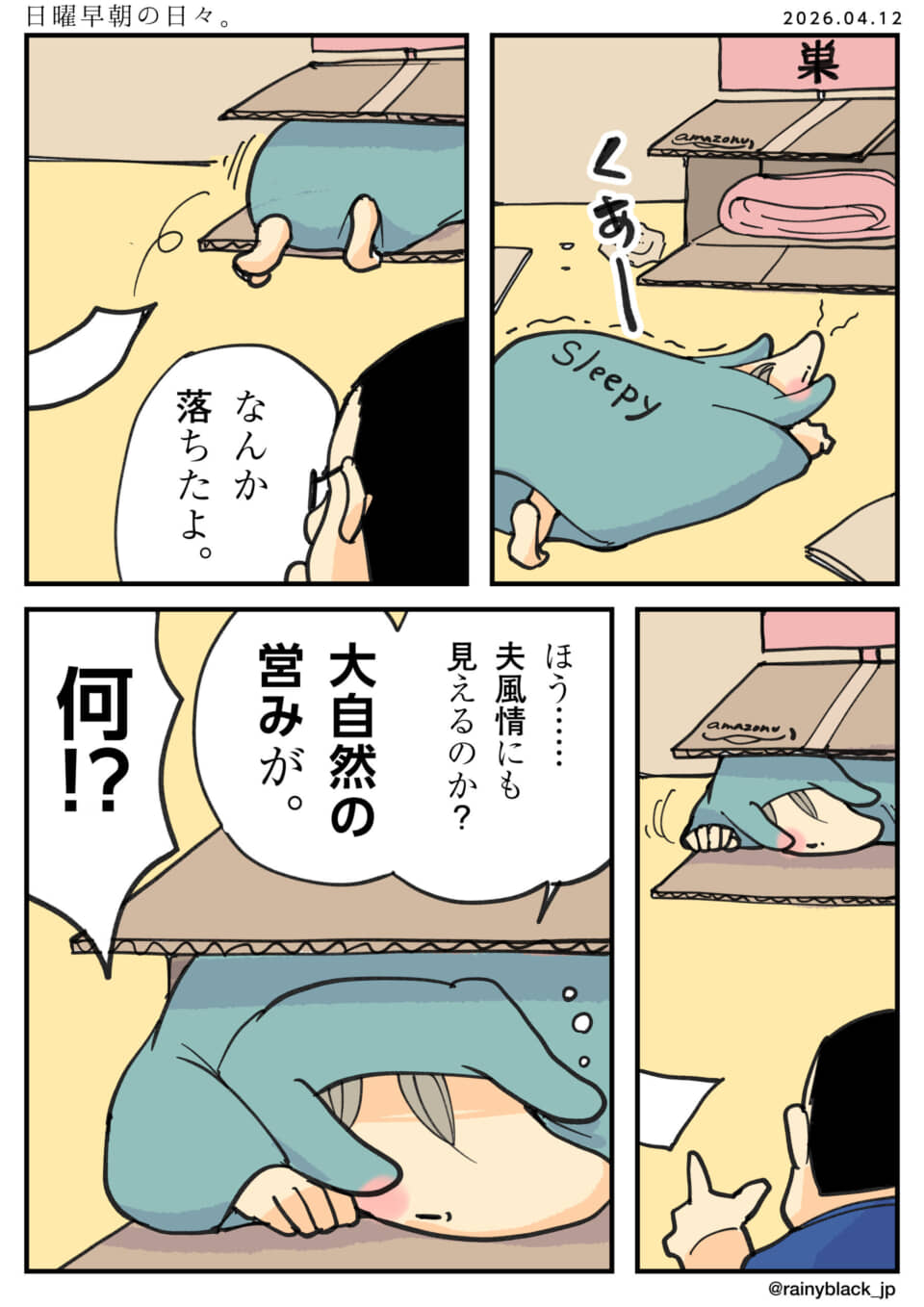 日曜の早朝、段ボール箱を「巣」にして眠る家内ちゃんを見つけた夫。家内ちゃんが寝ぼけて何かが落ちたと告げる。それは期限を過ぎたコンビニ払いの請求書だった。期限切れに気づいた夫は、普通に出せばいいものをなぜわざわざ後から出すのかと呆れつつ、慌ただしくツッコミを入れる。のんびりとした家内ちゃんの様子と、事務的なミスに対する夫の日常的な光景が描かれている。