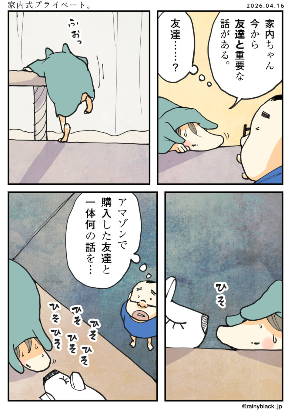 読みました。 送信 【翻訳用】AIによるこのマンガ・イラストの説明夫が家内ちゃんに対し「友達と重要な話がある」と切り出す。家内ちゃんが困惑する中、夫は「アマゾンで購入した友達」についてひそひそと話しかける。夫から「最近その友達と話さないね」と指摘された家内ちゃんは、「絶交した」と衝撃の告白をする。夫は動揺して「絶交……?」と戸惑うが、部屋の隅には「prime」のロゴが入った空の配送用段ボールが置かれているだけであった。 ほっこり シュール URLをコピーしました!