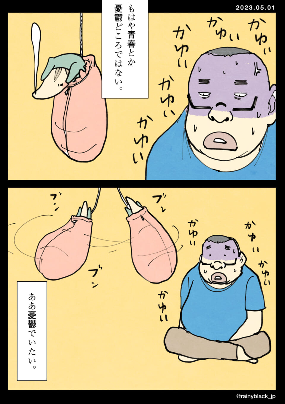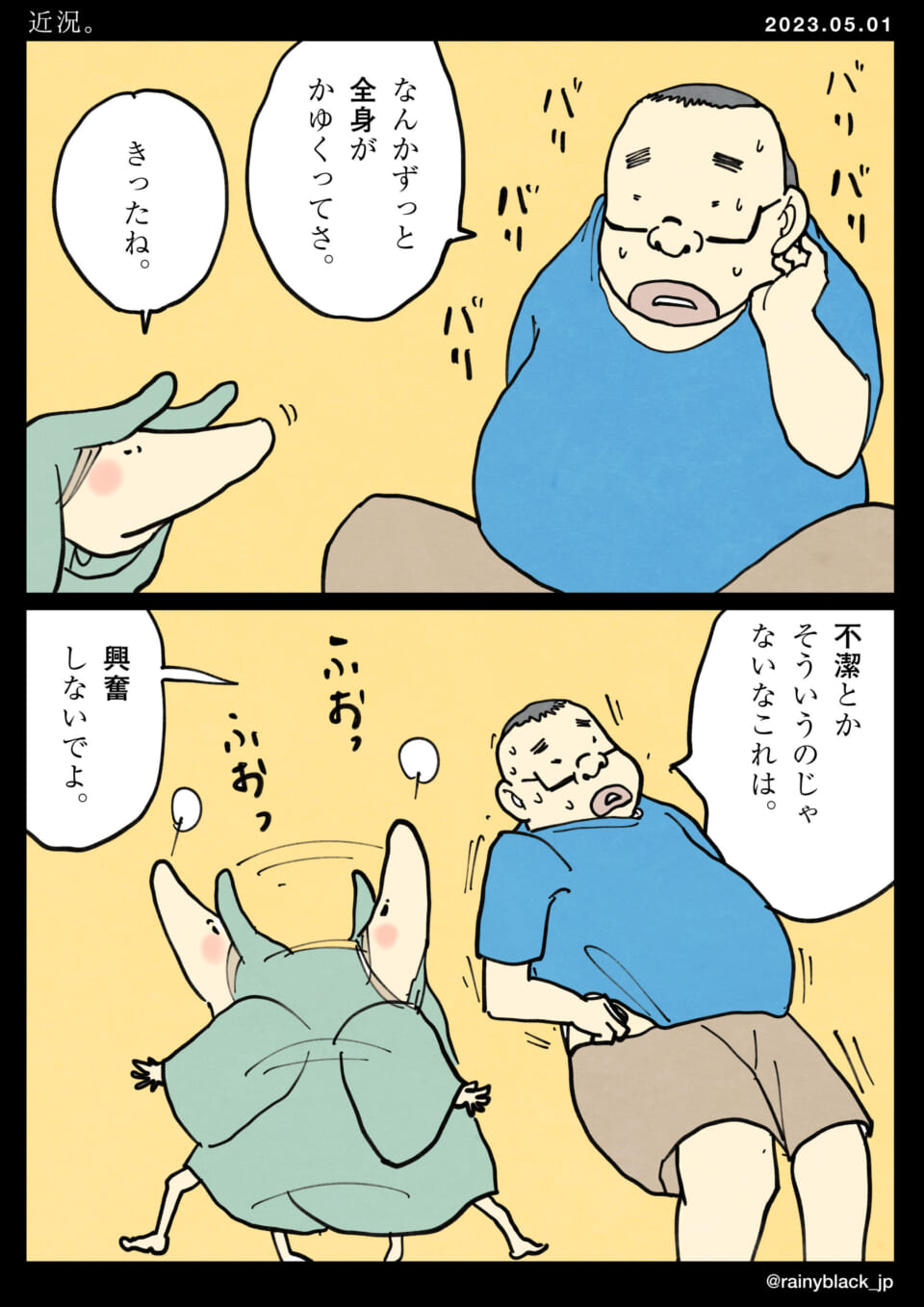 「近況。」 2023 5/01 シリーズ:断罪動物!家内ちゃん。 2023.5.1 15:35 読みました。 送信 【翻訳用】AIによるこのマンガ・イラストの説明男性が全身のかゆみに悩んでいる。彼は不潔さや興奮が原因ではないかと考えるが、どうにもならない。横で動いているキャラクターたちの不思議な様子や無関係な青春や憂鬱への考えに対して、ただ「憂鬱でいたい」と独り言をつぶやく。かゆい現実に直面しつつも、別の気持ちや状態に逃避したいという葛藤が描かれている。 シリーズ:断罪動物!家内ちゃん。 URLをコピーしました!