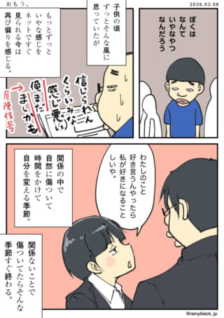 1ページエッセイマンガ。ある人物が病気について調べた際、ネット上で闘病ブログを発見する。しかし内容は病気そのものではなく、主治医の個人情報や悪口を書き綴るものだった。彼はそれに対して疑念を抱きつつ、このような状況が最期の生きる力であるのかと考える。自分はそういった最期は嫌だと思うが、絶対そうならないとは言えないと感じ、布団に顔を埋める姿で心情を表現している。