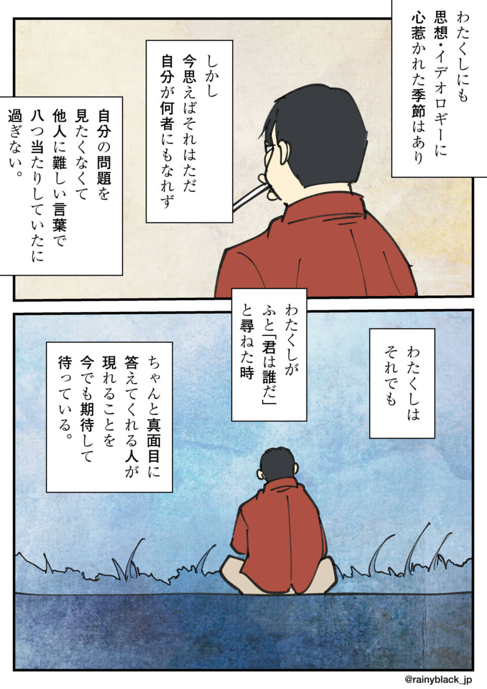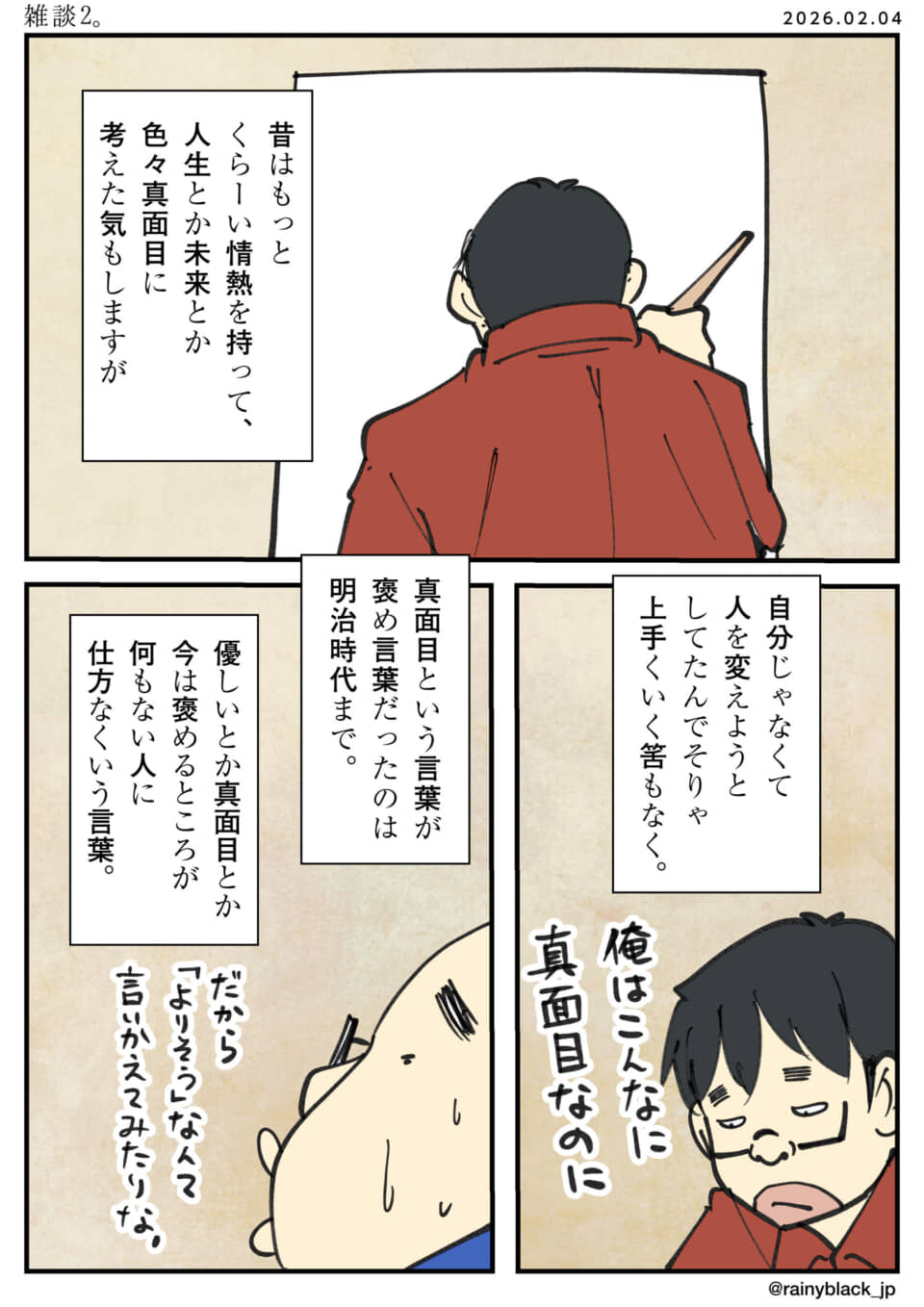 これは、ある人物が日記を書いている様子を描いた漫画である。 1コマ目では、人物が「人生とか未来とか考えた気もします」と、漠然とした将来への思いを綴っている。 2コマ目では、過去を振り返り、「明治時代まで」の「真面目」な言論について言及し、現代との違いを指摘している。 3コマ目では、現代の「真面目」さについて、「自分じゃなぐって」「人を変えようと」する様を、現代の「真面目」さへの疑問を呈している。 4コマ目では、過去の「君は誰だ」という問いかけから、自分自身を問い直す様子が描かれている。 5コマ目では、「今も期待して待っている」と、誰かが真面目に答えてくれることを期待している様子で締めくくられている。 全体として、現代社会における「真面目」さの意味や、自己認識、そして他者との関わり方について、登場人物が内省している様子が伺える。