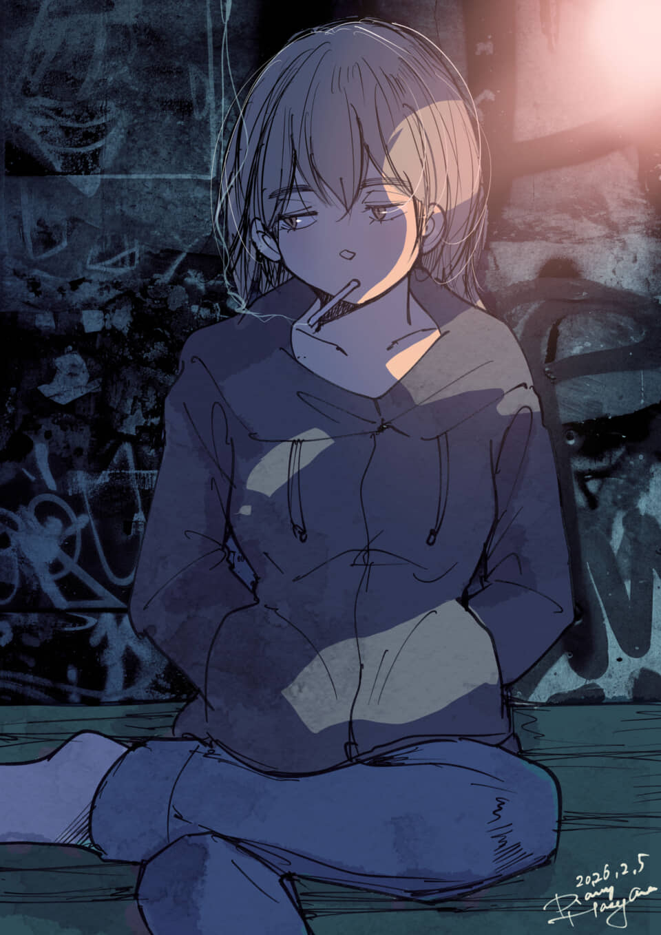暗い落書きが描かれた壁を背に、フード付きの青いパーカーとジーンズを身につけた少女が座っている。彼女は煙草をくわえ、どこか物憂げな表情を浮かべている。右上の強い光が少女の顔や肩を照らし、陰鬱な背景との対比が印象的だ。煙草の煙がゆらりと立ち上っている。