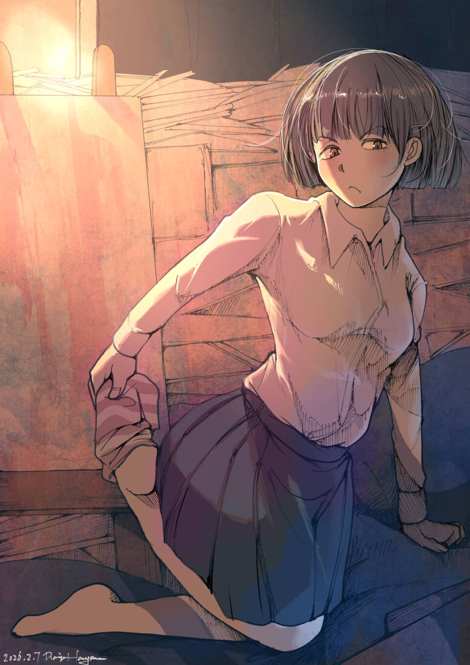 短いボブヘアの少女が、白いシャツとプリーツスカート姿で描かれている。片足を後ろに曲げて持ち、ストレッチをしているようなポーズだ。少女は少し不機嫌そうにも見える表情をしている。背景には木材のようなものが積み重なっており、暖色系の強い光が差し込んでいるため、全体的に温かみのある、しかしやや薄暗い雰囲気だ。アニメ調の絵柄で描かれている。