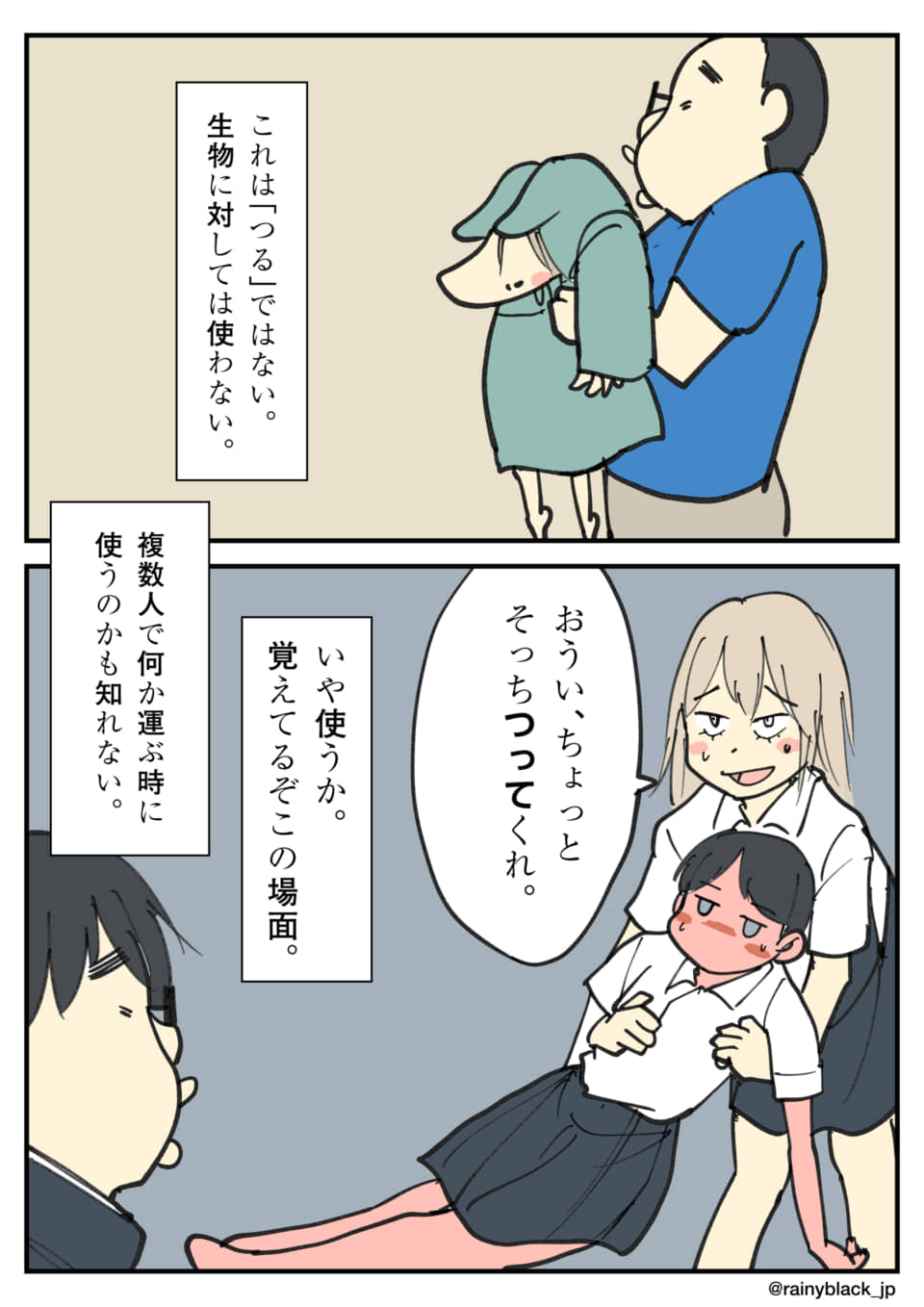 「つる。」 2026 2/09 高校編 マキタ 3ページ 2026.2.9 22:36 読みました。 送信 【翻訳用】AIによるこのマンガ・イラストの説明東海地方の方言で物を運ぶことを「つる」と呼ぶが、語り手は大学まで標準語だと信じていた。通常、生物には使わない言葉だが、複数人で意識のない人を運ぶ際に「つる」と表現する場面を思い出す。文化祭の打ち上げで酔った友人を皆で「つり」、その時、スカートがめくれそうになったのを密かに直したという、誰にも話さなかった記憶が明かされる。 高校編 マキタ 3ページ URLをコピーしました!