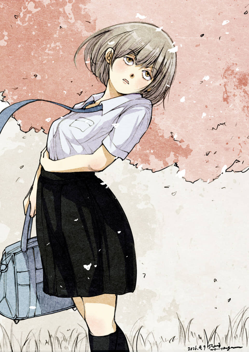 桜が舞い散る中、セキグチが制服姿で佇んでいる。風に髪をなびかせながら、どこか物憂げで切なげな眼差しをこちらへと向けている。思春期特有の揺れ動く感情を抱えているかのような、静寂に満ちた一場面である。背景に広がる淡い赤色は、彼女の内に秘められた感情や、過ぎ去る季節の儚さを象徴しているようにも見える。