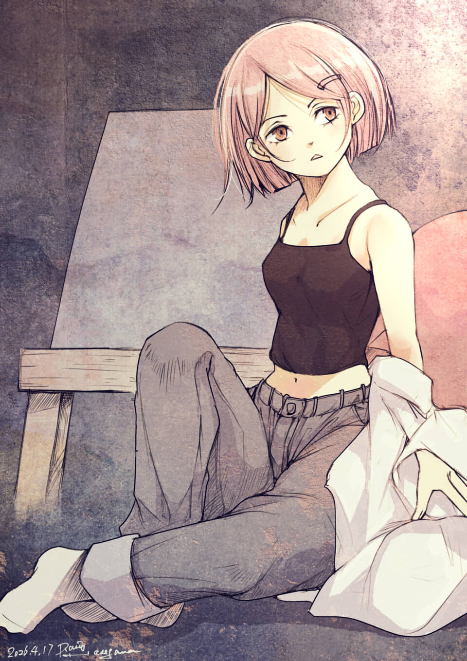 金曜夜のドローイング 読みました。 送信 このマンガ・イラストの説明薄暗い部屋の中で、杉ちゃんがこちらをじっと見つめている。肩出しのキャミソールを身に纏い、脱ぎかけの白い上着を手に掛けた姿は、どこかアンニュイで切なげな空気を漂わせている。座り込んだ彼女の視線と表情からは、言葉にできない複雑な感情が読み取れる。静寂が支配する空間で、彼女の存在感だけが際立っている。 大学編 杉ちゃん 1ページ 絵 ドキドキ 切ない URLをコピーしました!