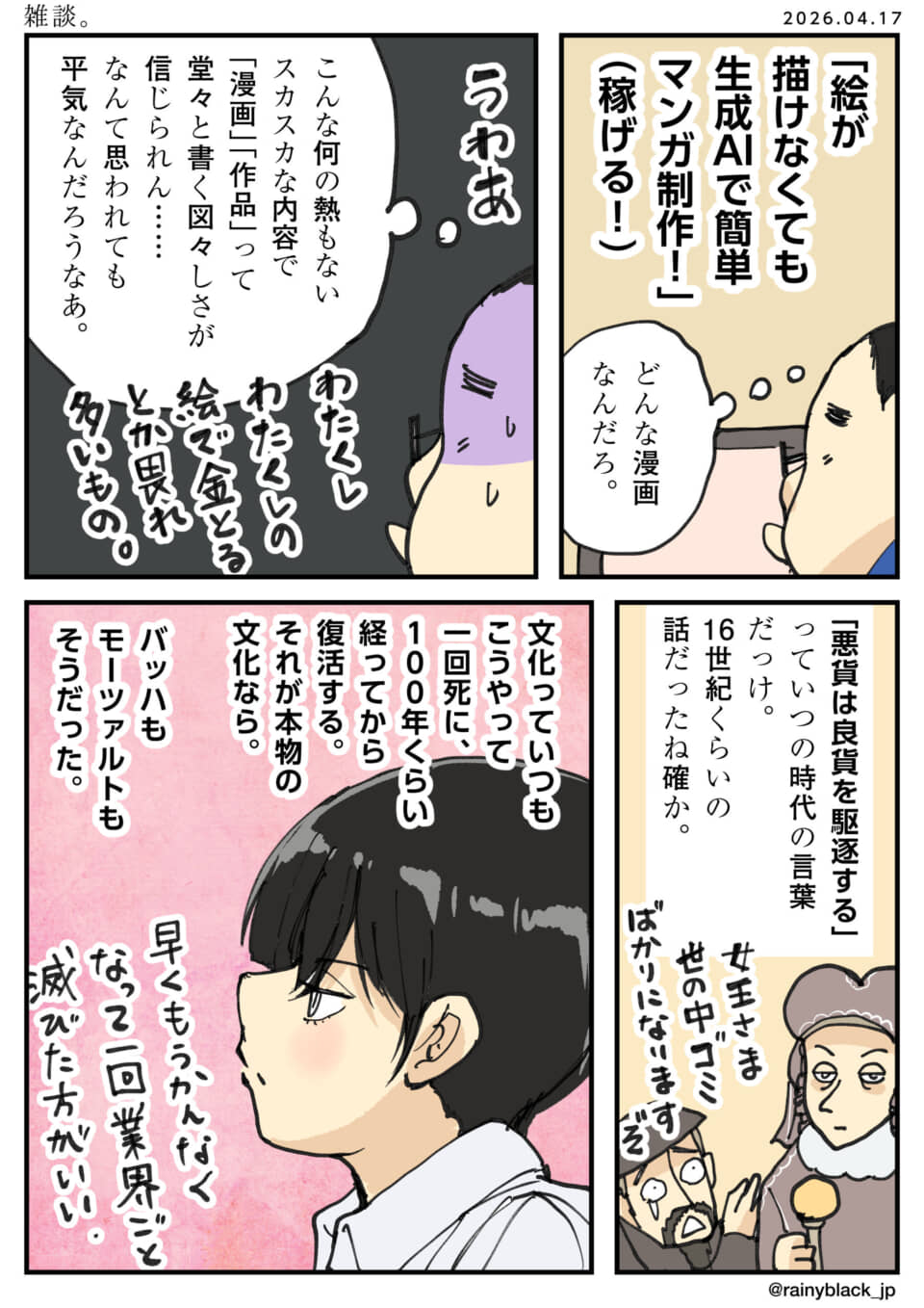 読みました。 送信 【翻訳用】AIによるこのマンガ・イラストの説明生成AIによる安易な漫画制作に対し、ハセガワは嫌悪感を抱く。中身のない作品が溢れる現状を憂い、自身の作品が同様に見られることへの不安を吐露する。悪貨が良貨を駆逐するという格言を引き合いに出し、文化の衰退や自身の業界に対する悲観的な見解を語り、一度滅びるべきだと強く批判する。 その他 雑談・雑記 1ページ 憂鬱 URLをコピーしました!