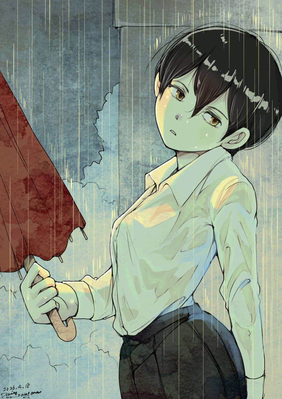 土曜朝のドローイング。 読みました。 送信 このマンガ・イラストの説明雨が降りしきる中、マキタが赤い傘を手に立ち尽くしている。濡れたシャツが肌に張り付く冷たさと、濡れ鼠のまま何かを待つような物憂げな視線が、どこか切ない緊張感を漂わせている。周囲には誰もいない。ただ降り続く雨音だけが静寂を埋めていく中で、マキタの胸の内にある言葉にできない昂揚と憂鬱が、その瞳に静かに宿っている。 高校編 マキタ 1ページ 絵 ドキドキ 憂鬱 URLをコピーしました!