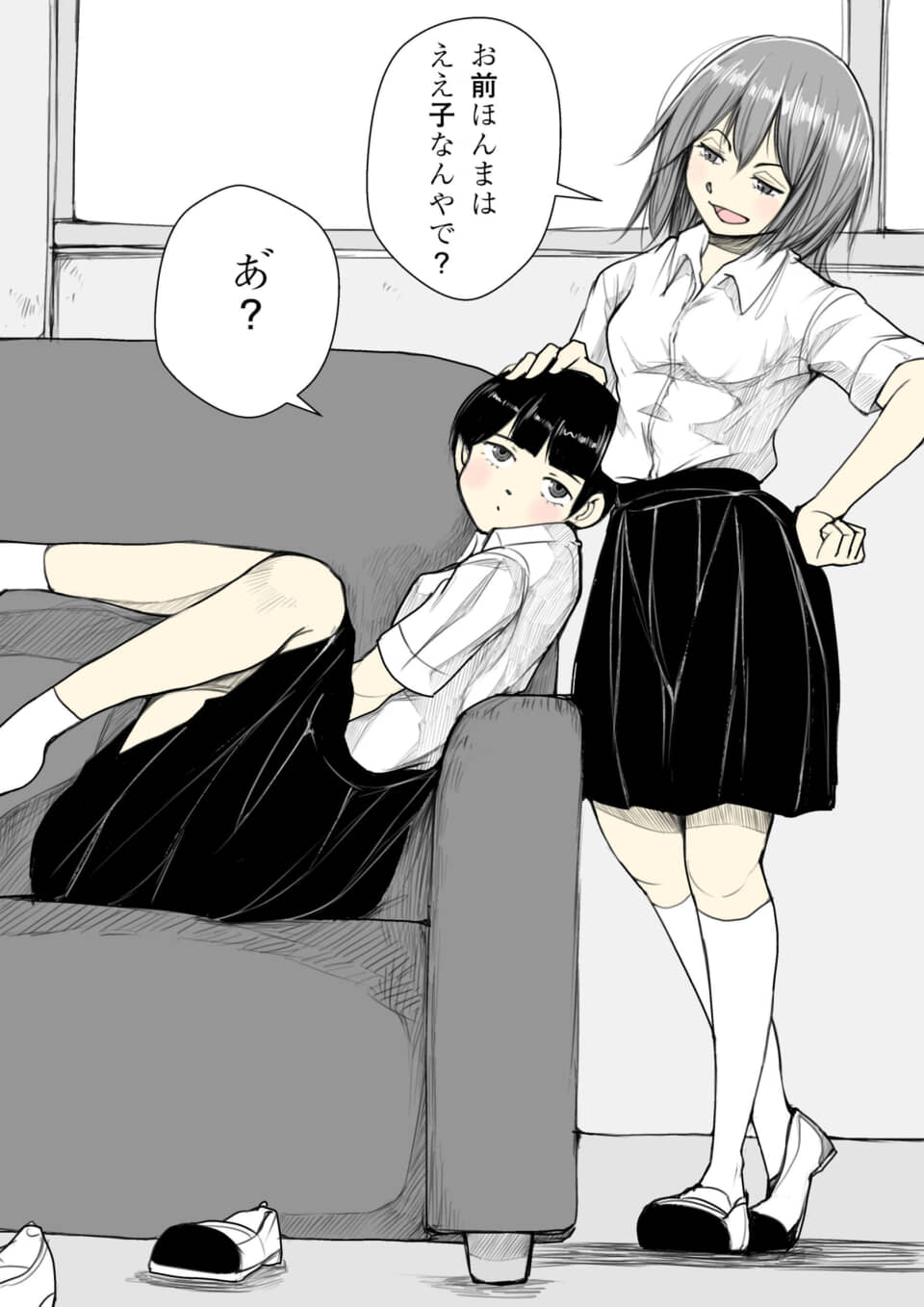 ソファに座る少女の頭を撫でて話しかける、制服姿の二人。