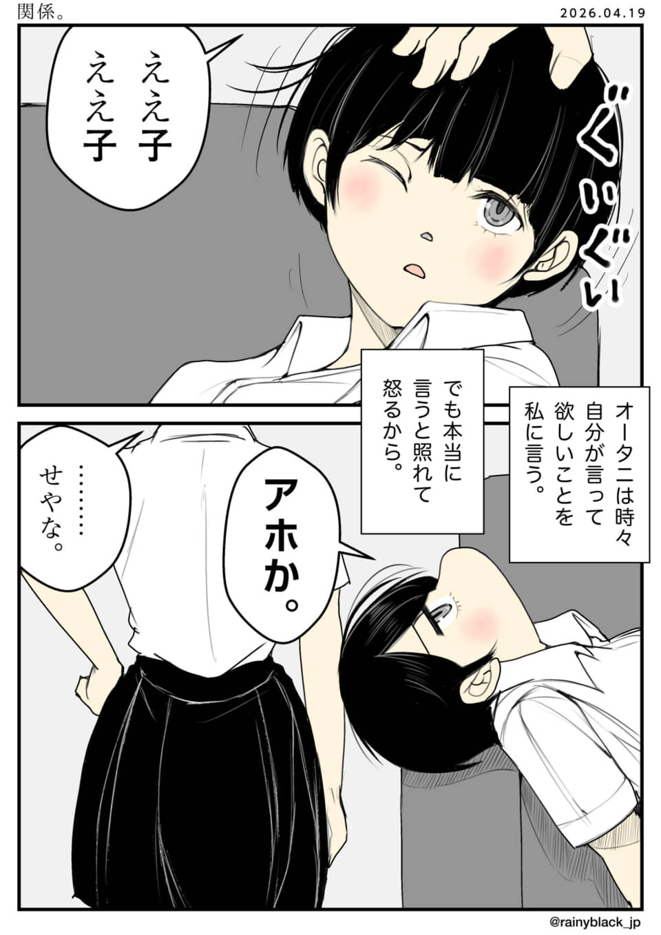 ソファーで寛ぐマキタに対し、オータニが頭を撫でながら「お前ほんまはええ子なんやで」と語りかける。マキタはぶっきらぼうに「あ?」と返す。オータニは続けてマキタの頭をぐいぐいと撫で、優しく声をかける。マキタは内心で、オータニが時折自分の言いたいことを代弁することをわかっている。素直になれないオータニに「アホか」と悪態をつき、オータニが「せやな」と応じる、二人の親密で静かな日常の一コマ。