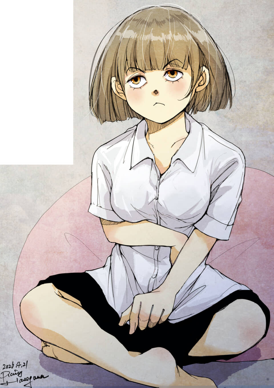 読みました。 送信 このマンガ・イラストの説明白いシャツと黒いボトムスを身にまとったセキグチが、ピンク色のクッションの上にあぐらをかいて座っている。彼女は腕を組み、何かを思案しているかのように、どこか不服そうな表情で真っ直ぐこちらを見つめている。思春期特有の繊細さと、独特な重苦しさが漂う日常のひとコマである。背景には空白の吹き出しが配されており、彼女の心情が示唆されている。 高校編 セキグチ 1ページ 絵 思春期 日常 URLをコピーしました!