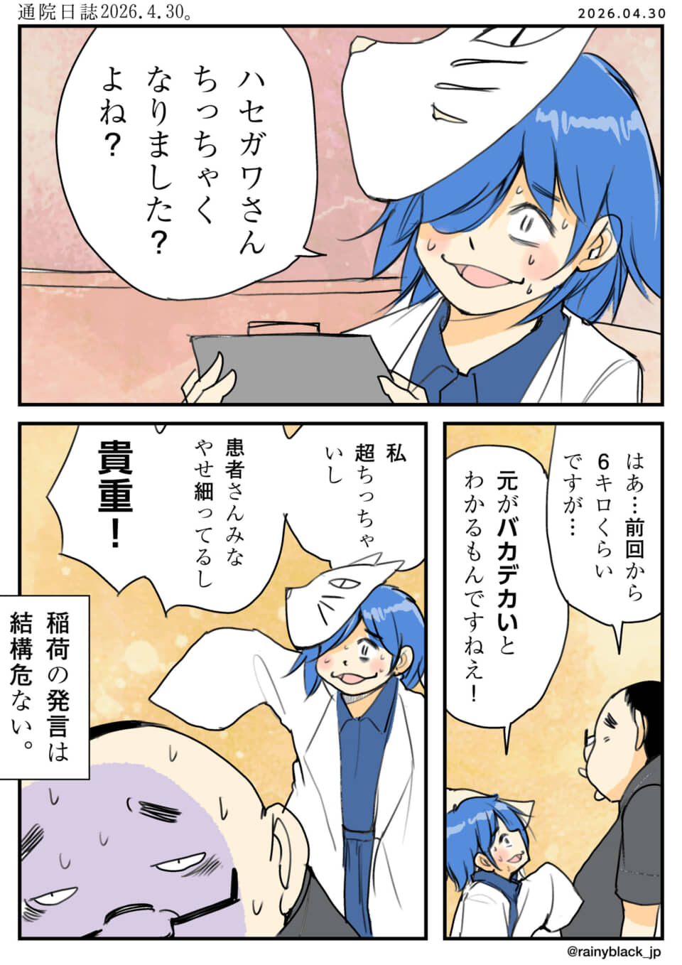 ハセガワが通院すると、Dr稲荷に前回から6キロ痩せたことを指摘される。「元がバカデカい」ため変化が分かると言われ、ハセガワは困惑する。その後、健康的な検査結果を見て感心するハセガワに対し、Dr速井は「もっと強力な薬がある」と不穏な発言をする。速井の危うい言動に、ハセガワは内心で冷や汗をかくのだった。
