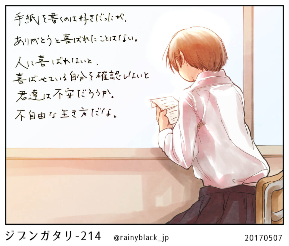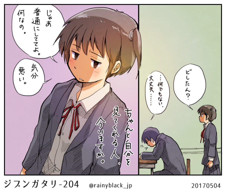 このストーリーは、自己探求や人間関係、芸術への情熱を通じて感じる不安や喜びを描いた短編マンガである。主人公たちは、自分の感情や考えを整理し、社会との接点を模索し続ける。彼らは一人が好きだと述べつつも、他者とのつながりを求める瞬間がある。絵を描くことや日々の会話が彼らにとっての自己表現となっているが、一方で人付き合いの複雑さには悩まされている。最終的には、人生の課題や喜びに向き合いながら成長していく姿を描いている。